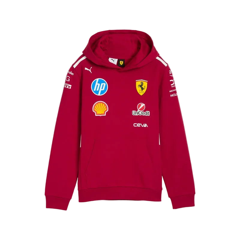Scuderia Ferrari's official 2025 team hoodie by PUMA delivers authentic motorsport style for young fans. Crafted from premium cotton-blend fabric, this hoodie features the iconic Prancing Horse emblem and team graphics that showcase genuine F1 heritage. The relaxed fit ensures comfort during casual wear, while quality construction guarantees durability through active play. Perfect for Ferrari enthusiasts who want to represent their favorite Scuderia with confidence and style.
