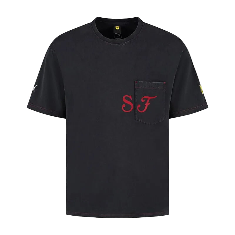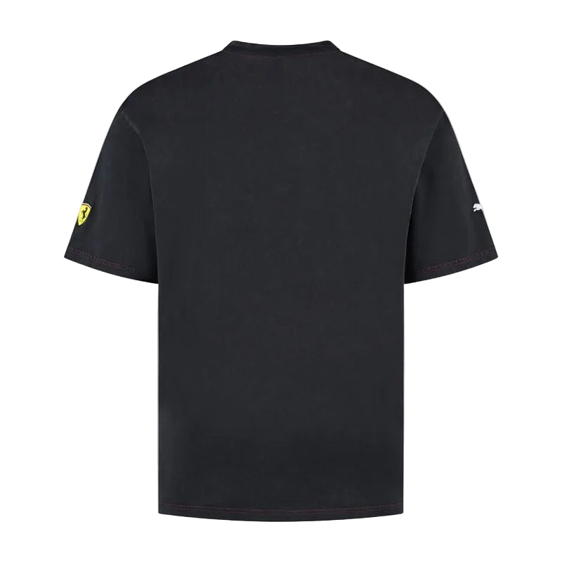 Part of the 2025 seasonal PUMA collection for Scuderia Ferrari, the crew neck T-shirt combines a flocked 'SF' print on the chest with a faded wash fabric effect for a special Ferrari look. Classic Ferrari and PUMA logos can be found on the sleeves.