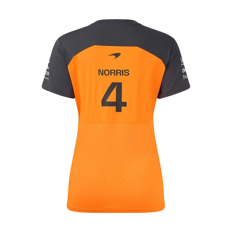 Women's version of Lando Norris' official McLaren Formula 1 Team T-shirt, as based on the teamwear worn by Lando throughout the 2025 Formula 1 season. The Women's T-shirt features a large 'Norris 4' print on the rear alongside all the official 2025 season team and partner branding. Produced by official team partner Castore.