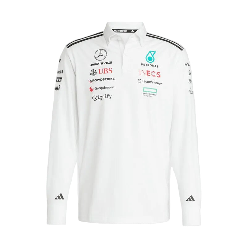 Long sleeve version of the 2025 Team Polo, and part of the 2025 adidas Motorsport range for the Mercedes-AMG Petronas Formula One Team. As worn throughout the 2025 Formula One season, a poly-cotton blend Long Sleeve Team Polo with added stretch, button up collar, team and partner logos, and the iconic adidas 3-stripes on the shoulders.