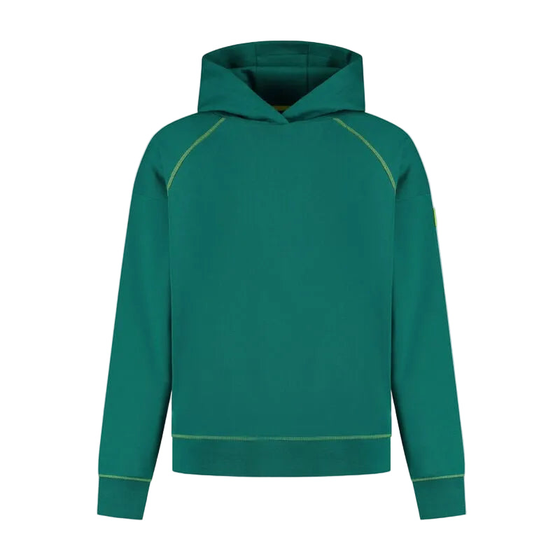 100% organic cotton relaxed fit Hoodie, with large Aston Martin Formula One® Team 'wordmark' print graphic on the rear. Lined hood, team logo sleeve badge, and contrast green cover stitch seams complete the unique team take on a classic fanwear piece.